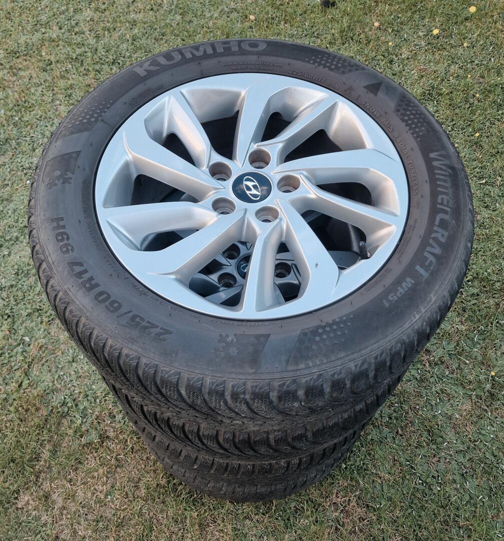 Komplet oryginalnych kół Hyundai (felgi z oponami). Rozmiar 17 cali. Zestaw wraz z czujnikami ciśnienia i dekielkami. Opony Kumho Wintercraft 225/60 (stan jak na zdjęciach).