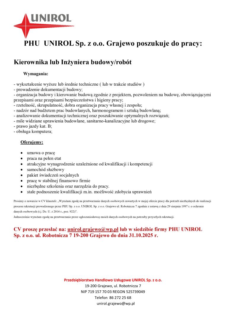 CV proszę przesłać na: unirol.grajewo@wp.pl lub w siedzibie firmy PHU UNIROL